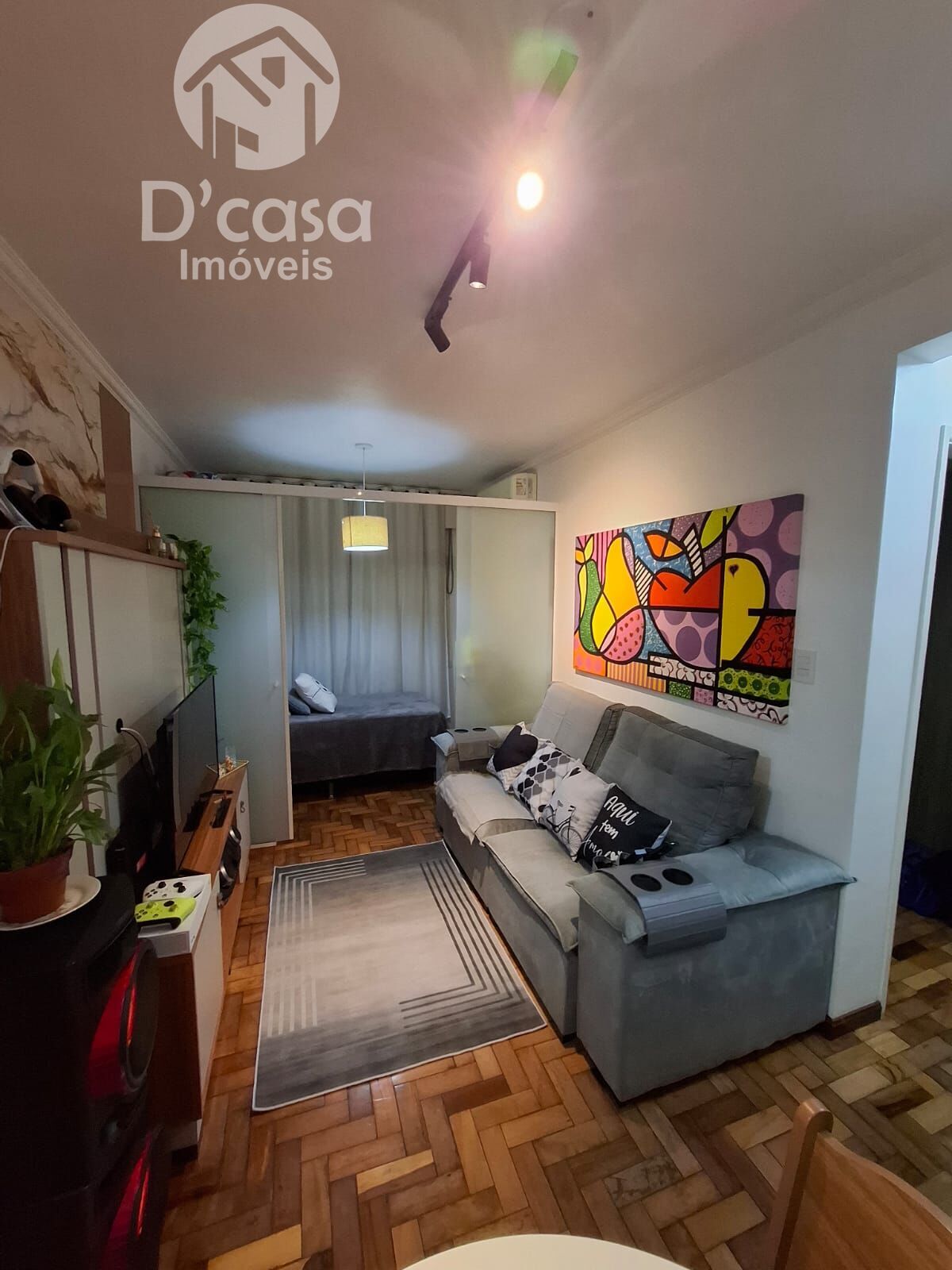 1 dormitório, transformado em 2, sala estar/jantar, cozinha, banheiro social, área de serviço e vaga de garagem.