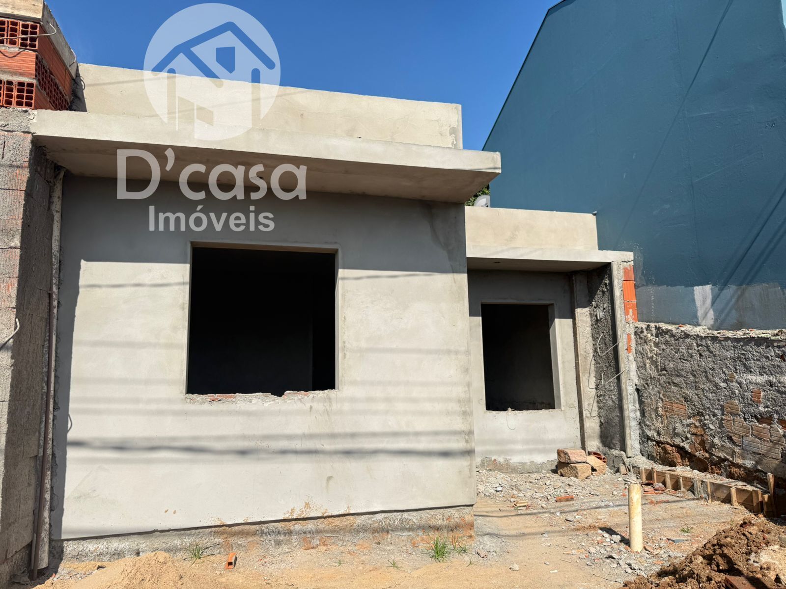 Casa com laje, acabamento em massa corrida e pisos cerâmicos retificados, aberturas externas em alumínio.